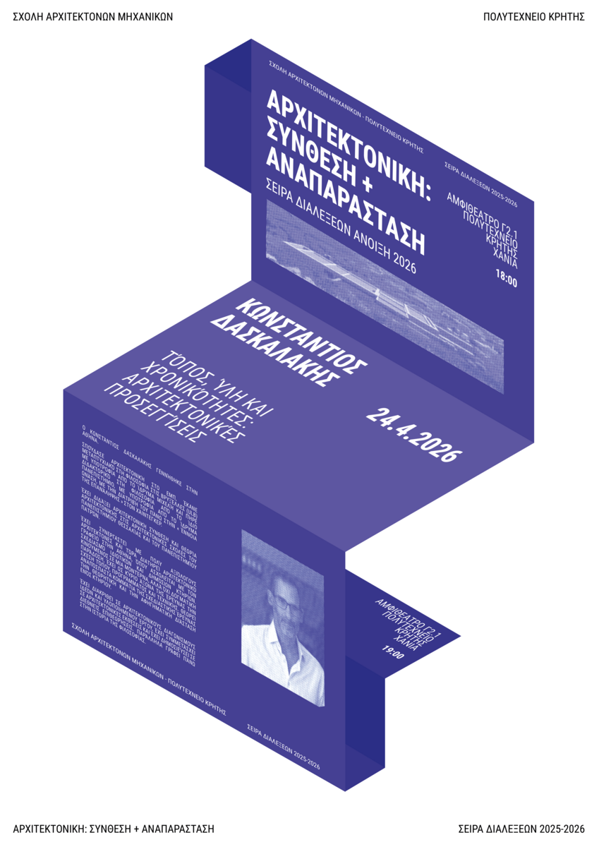 Η Σχολή Αρχιτεκτόνων μηχανικών του Πολυτεχνείου Κρήτης οργανώνει για την Άνοιξη 2026 σειρά διαλέξεων με γενικό θέμα ΑΡΧΙΤΕΚΤΟΝΙΚΗ: ΣΥΝΘΕΣΗ & ΑΝΑΠΑΡΑΣΤΑΣΗ, όπου διακεκριμένοι/ες αρχιτέκτονες θα παρουσιάζουν το έργο τους αναφερόμενοι παράλληλα στον διάλογο ανάμεσα στην αρχιτεκτονική σύνθεση και την αναπαράσταση.