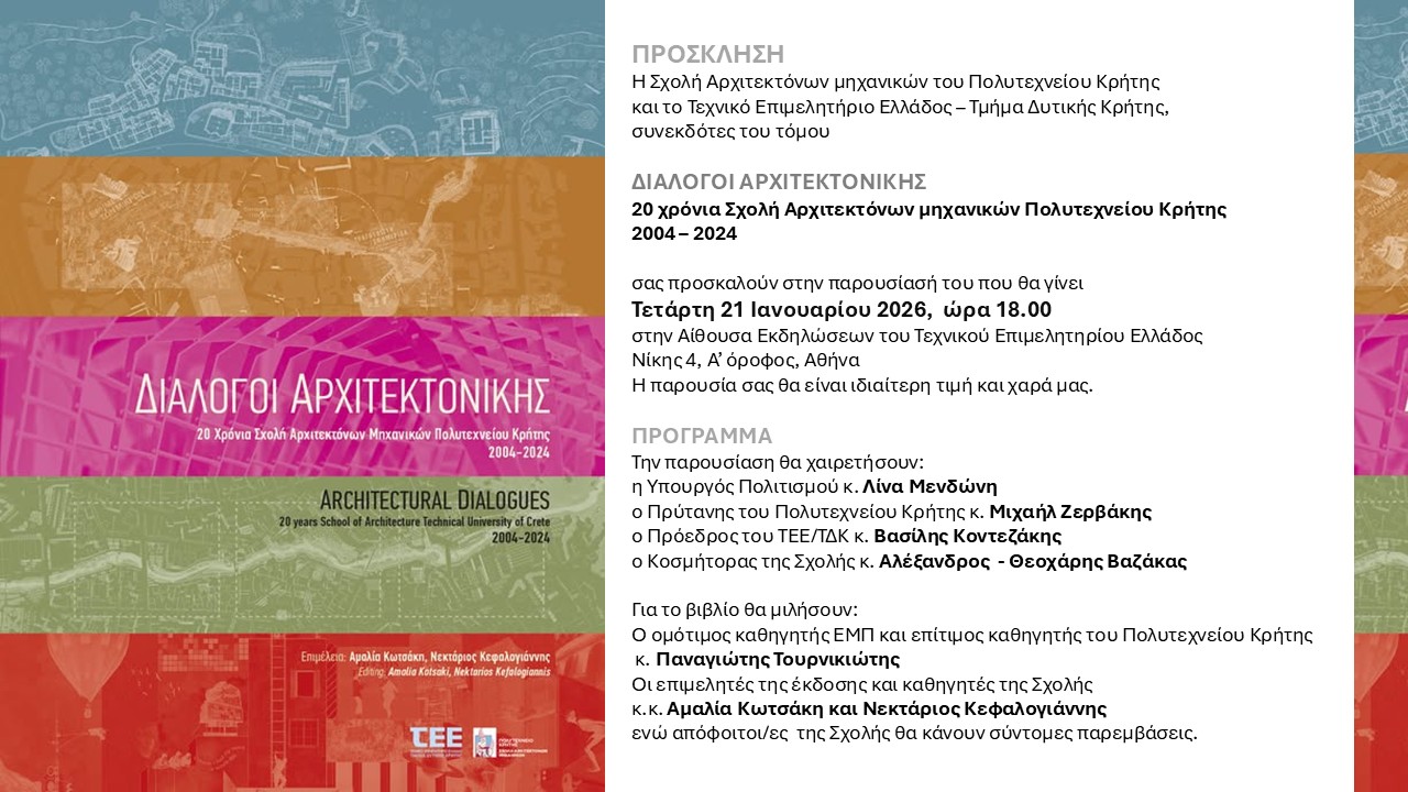 ΔΙΑΛΟΓΟΙ ΑΡΧΙΤΕΚΤΟΝΙΚΗΣ - 20 χρόνια Σχολής Αρχιτεκτόνων μηχανικών Πολυτεχνείου Κρήτης 2004-2024 ως συνέκδοση της Σχολής και του ΤΕΕ/ΤΔΚ, σε επιμέλεια των καθηγητών της Σχολής κκ. Αμαλίας Κωτσάκη και Νεκτάριου Κεφαλογιάννη.