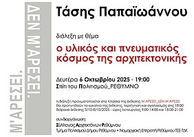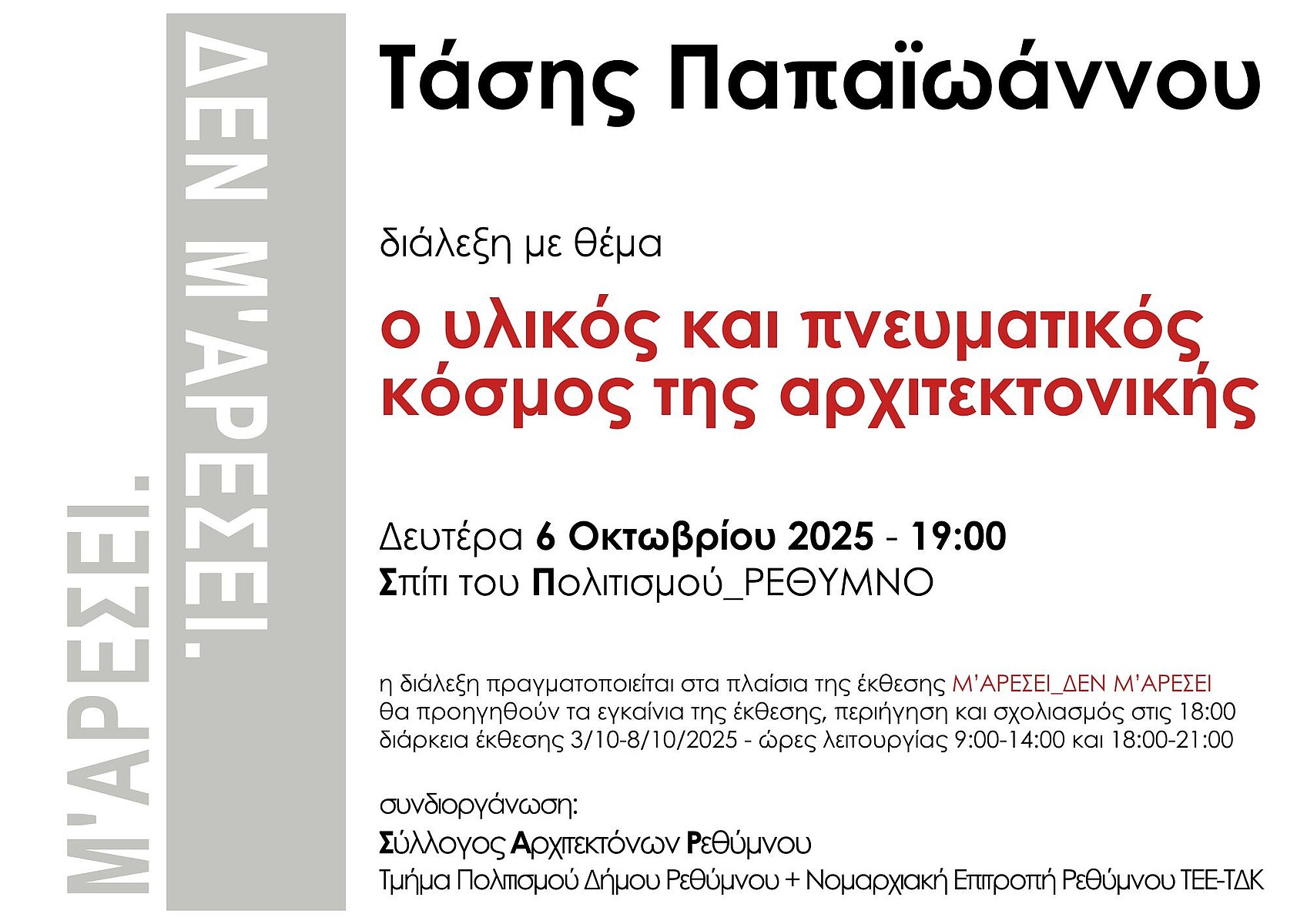 Ο Σύλλογος Αρχιτεκτόνων Ρεθύμνου σε συνδιοργάνωση με το Τμήμα Πολιτισμού του Δήμου Ρεθύμνου και τη Νομαρχιακή Επιτροπή του ΤΕΕ ΤΔΚ σας προσκαλούν στη διάλεξη του διακεκριμένου αρχιτέκτονα και καθηγητή του ΕΜΠ ΤΑΣΗ ΠΑΠΑΙΩΑΝΝΟΥ με θέμα 'Ο υλικός και πνευματικός κόσμος της αρχιτεκτονικής' τη Δευτέρα 6 Οκτωβρίου 2025 και ώρα 19:00 στο Σπίτι του Πολιτισμού, οδός Εμμ. Βερνάδου 12, στο Ρέθυμνο.