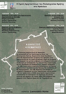 Ο Σύλλογος Αρχιτεκτόνων Νομού Ηρακλείου (ΣΑΝΗ), σε συνεργασία με τη Σχολή Αρχιτεκτόνων Μηχανικών του Πολυτεχνείου Κρήτης (υπό την επιστημονική επιμέλεια των Ν. Σκουτέλη και Α. Τζομπανάκη), σας προσκαλεί σε μια σειρά από τέσσερις θεματικές διαλέξεις με την πρώτη να λαμβάνει χώρα την Παρασκευή 13/03 στο ΤΕΕ/ΤΑΚ (οδός Πρεβελάκη & Γρεβενών).