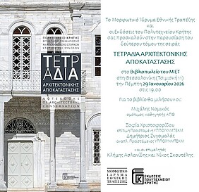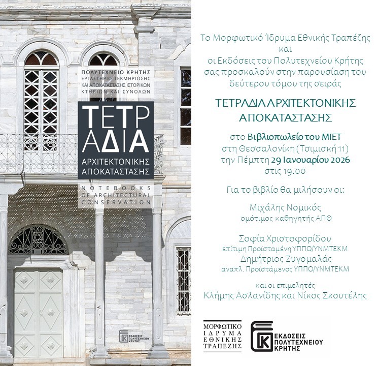 Παρουσίαση του βιβλίου Τετράδια Αρχιτεκτονικής Αποκατάστασης, τεύχος 2, στο βιβλιοπωλείο του Μορφωτικού Ιδρύματος Εθνικής Τραπέζης στη Θεσσαλονίκη (Τσιμισκή 11) την Πέμπτη 29 Ιανουαρίου 2026, στις 19.00